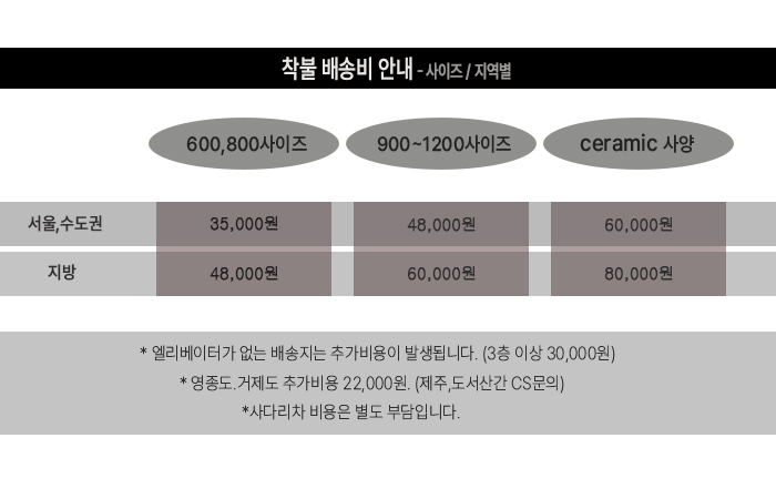 착불배송비(600-800사이즈 : 서울/수도권 : 35,000원 / 지방 48,000원 900-1200사이즈 : 서울/수도권 : 48,000원 / 지방 60,000원 세라믹: 서울/수도권 : 60,000원 / 지방 80,000원)